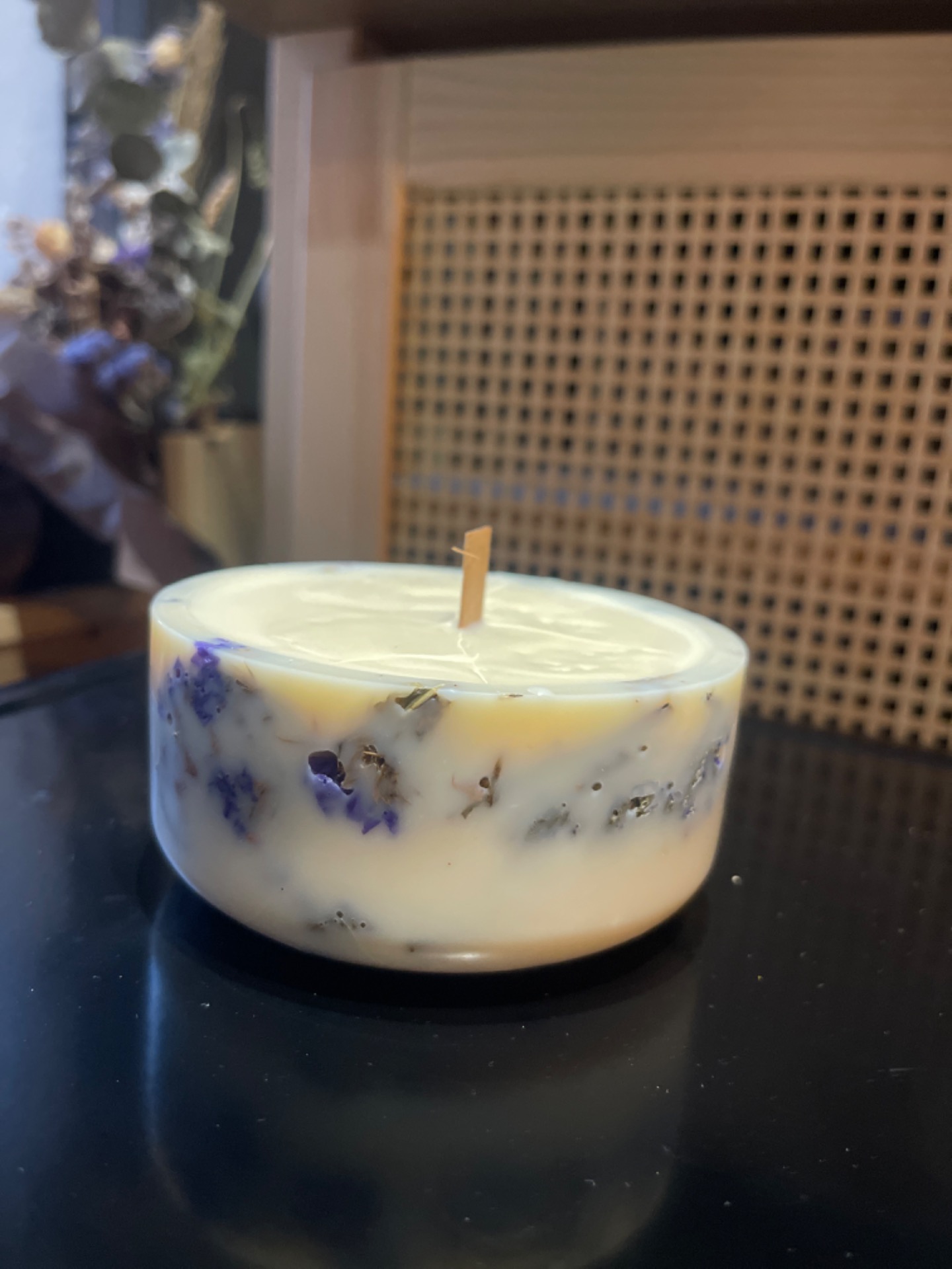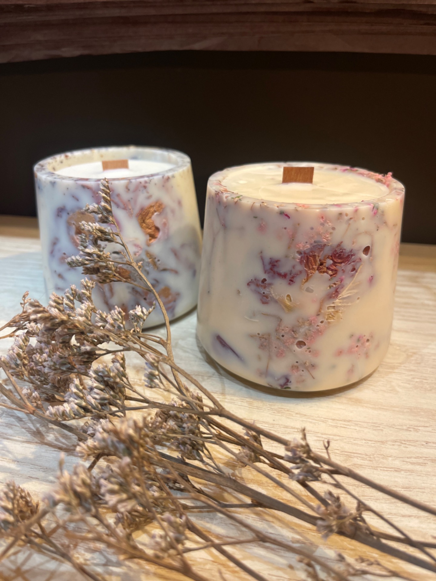 Una candela botanica artigianale realizzata con i fiori essiccati della nostra flower farm. La parte esterna, in cera d'oliva, custodisce delicatamente i fiori creando una forma ispirata a un vaso. All'interno, una candela in cera di soia con stoppino in legno diffonde una luce calda e avvolgente. Quando accesa, la cera diventa leggermente trasparente e rivela i fiori, creando un effetto lanterna intimo e suggestivo. 100% vegetale. Fiori a scelta su ordine. Chiedi piu info Colata a mano in Umbria.