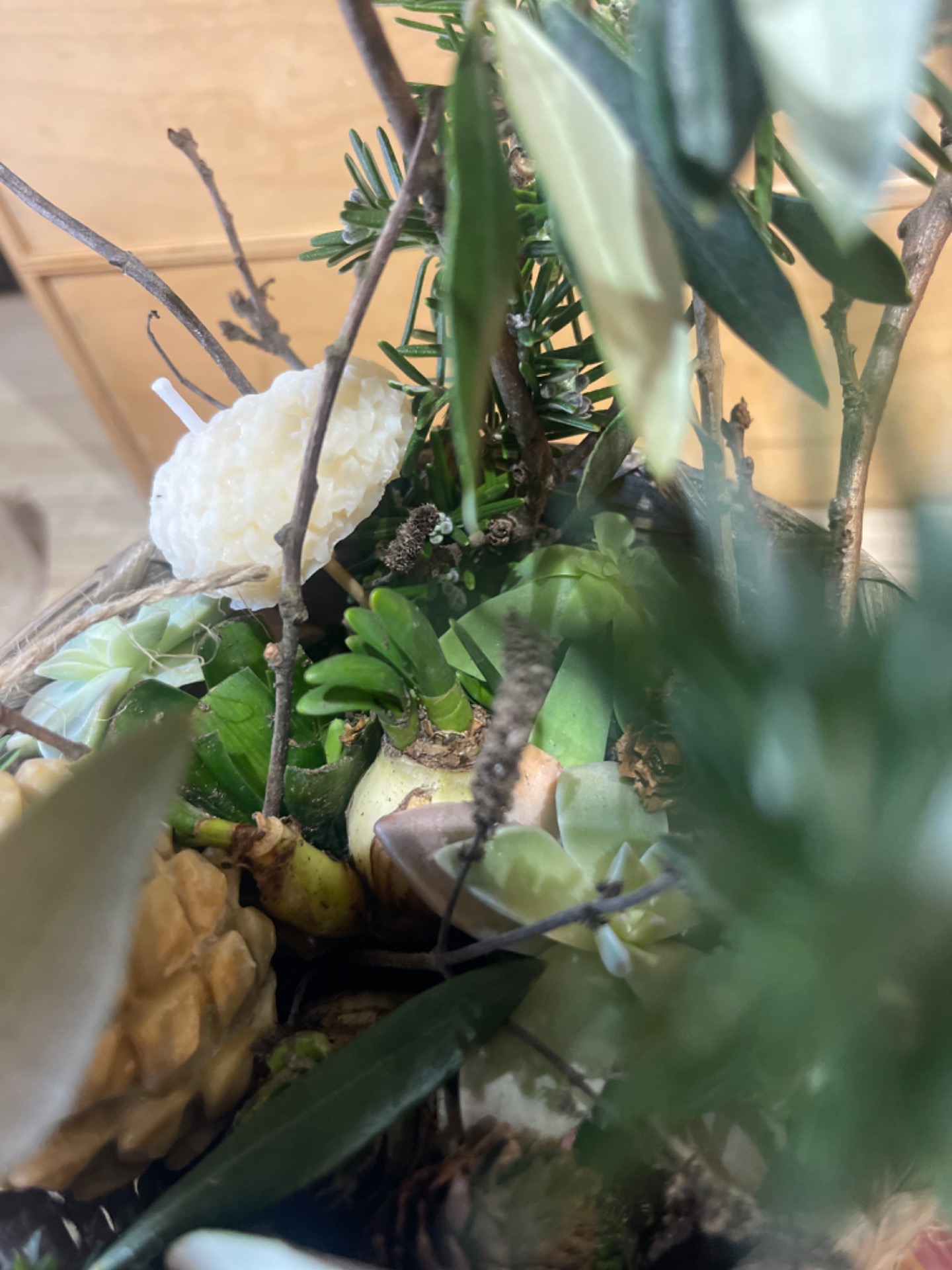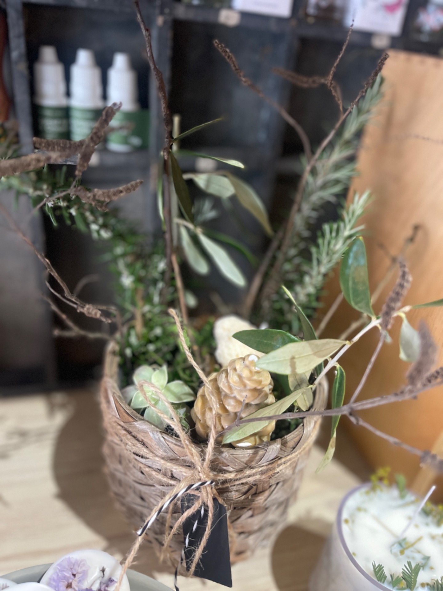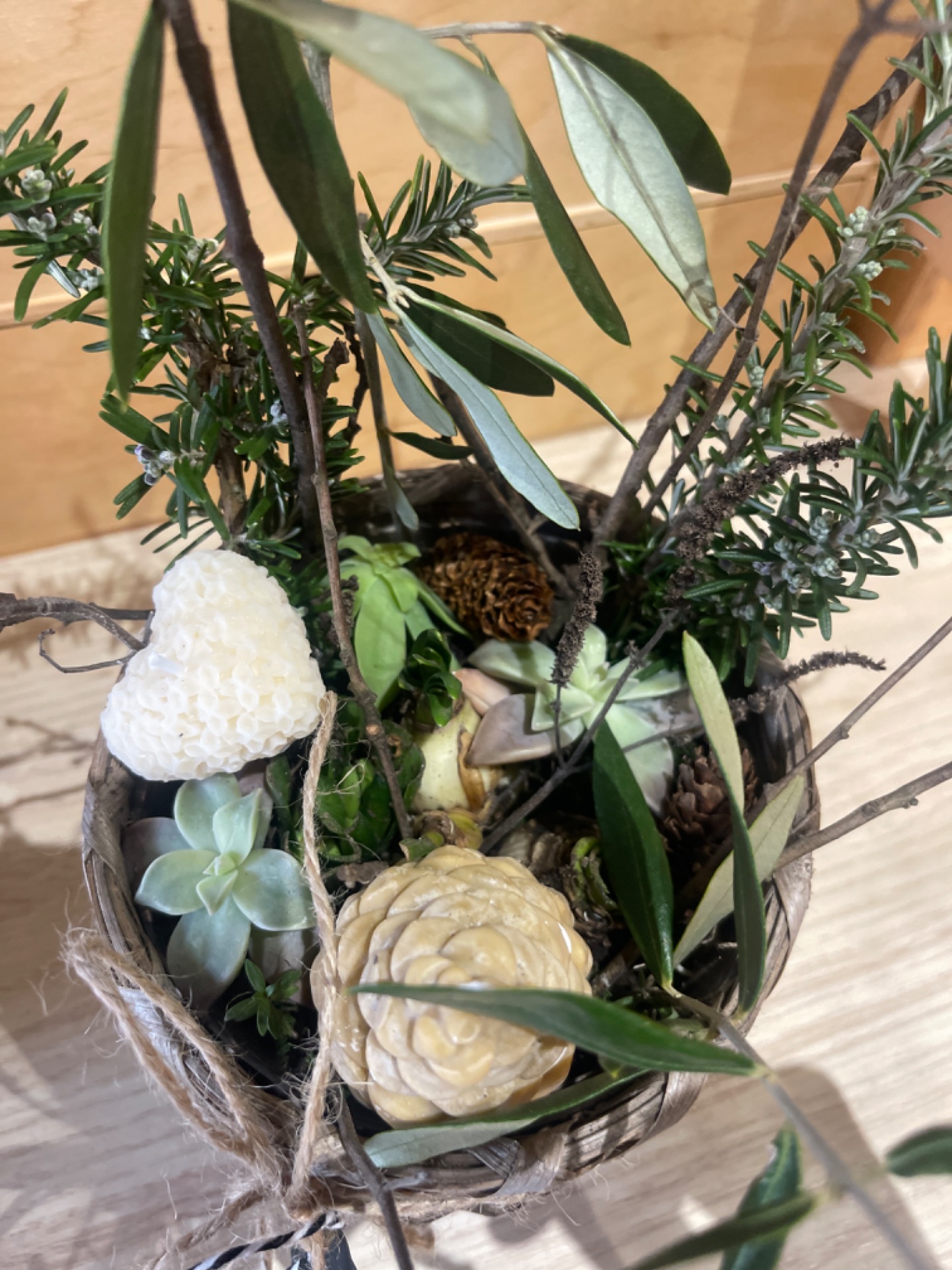 Composizione in cestino con bulbi selezionati dalla Farm (giacinti e muscari), rami di olivo, rosmarino in fiore, rami decorativi e una candela a forma di cuore. Realizzata a mano. Ogni pezzo è unico.