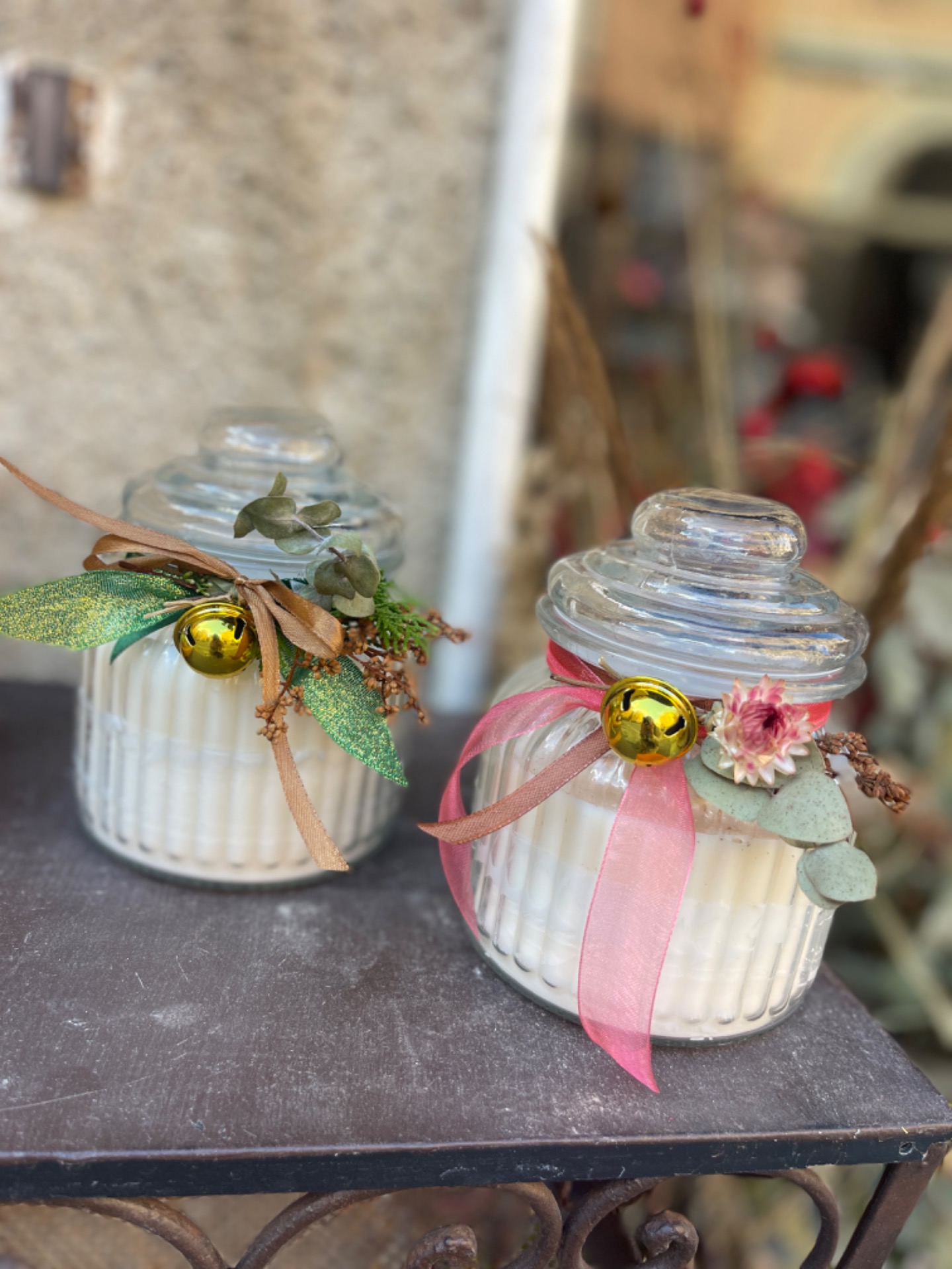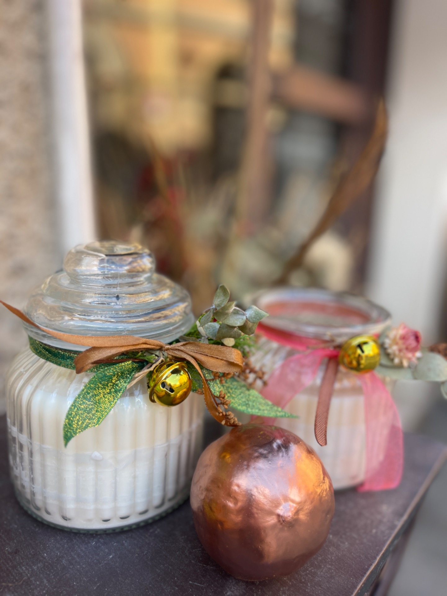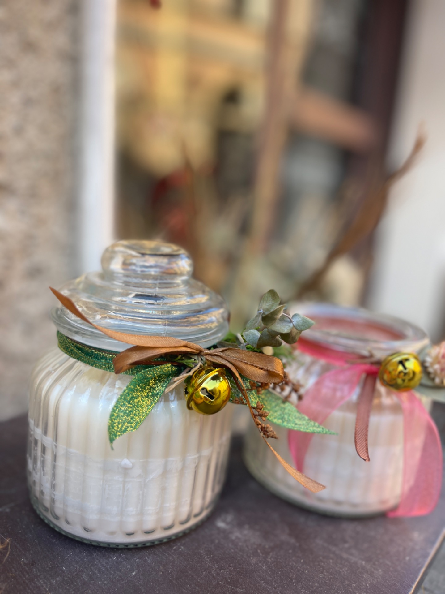 Cozy lights, Christmas scents & golden bells…These handmade candles in glass jars are filled with warmth, christmas scent, dried flowers & love