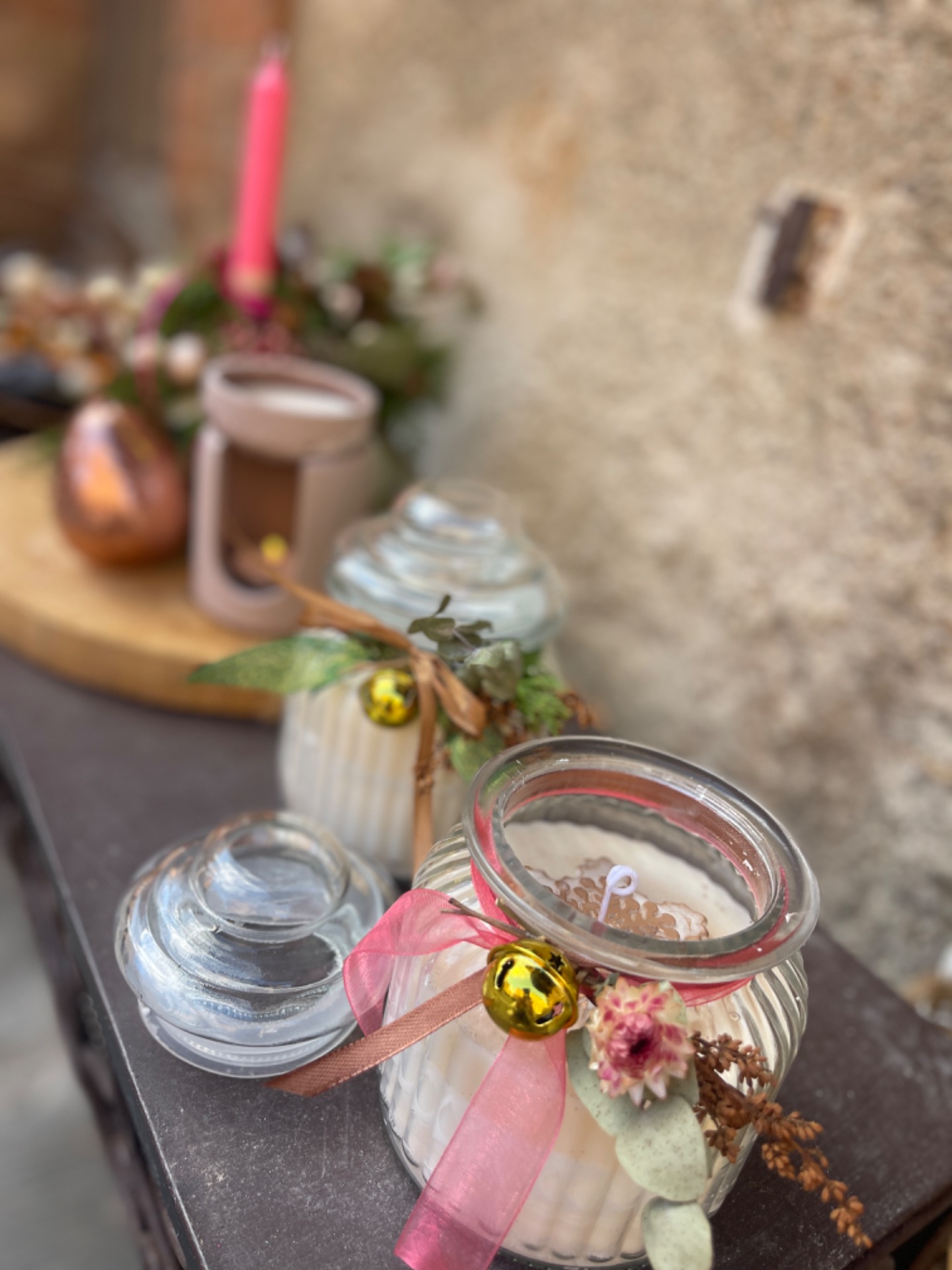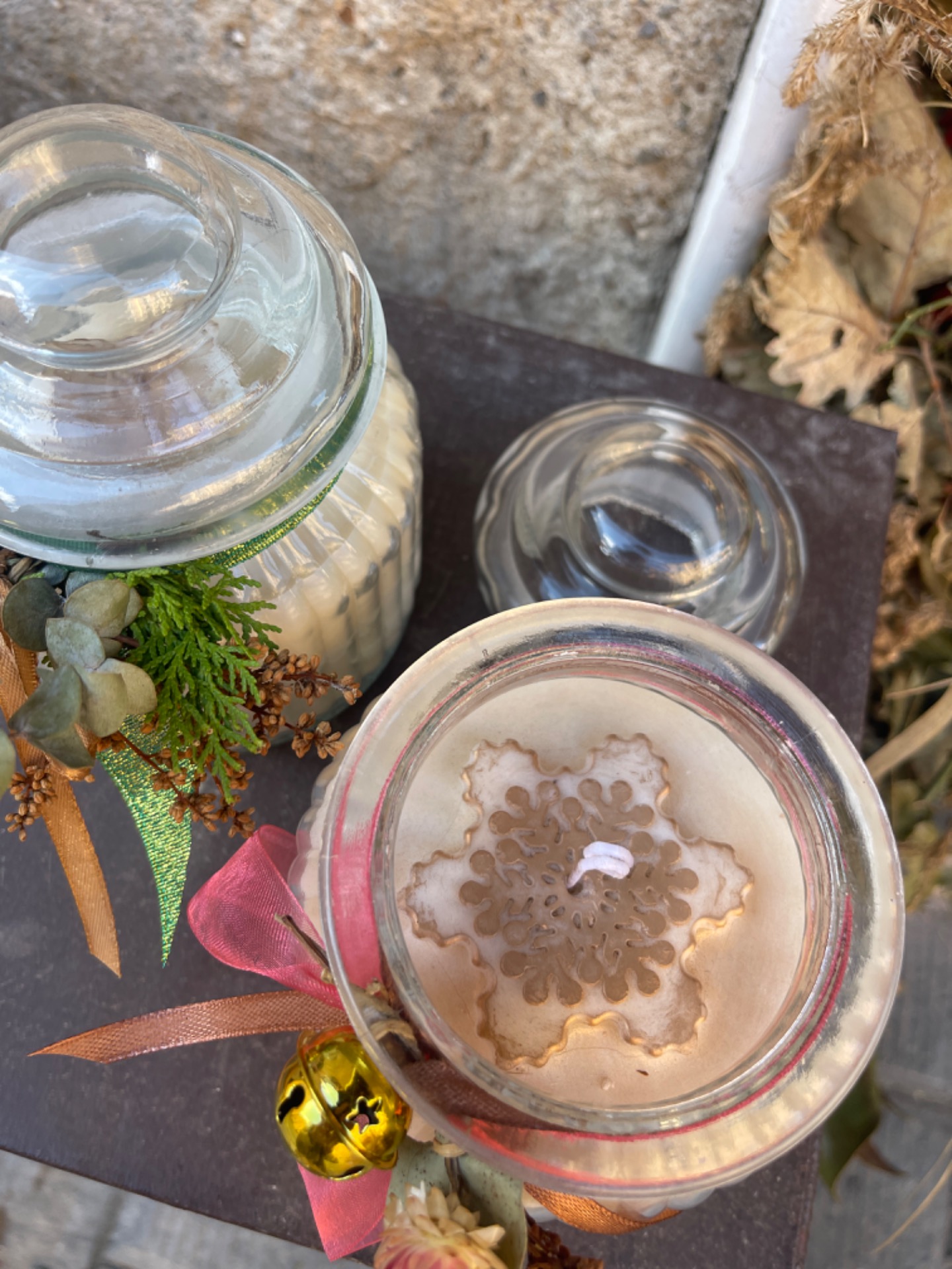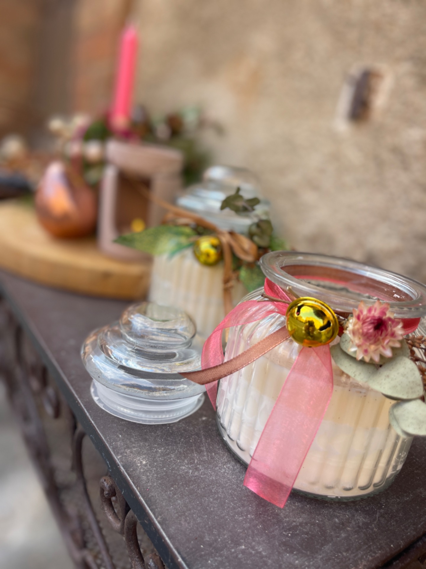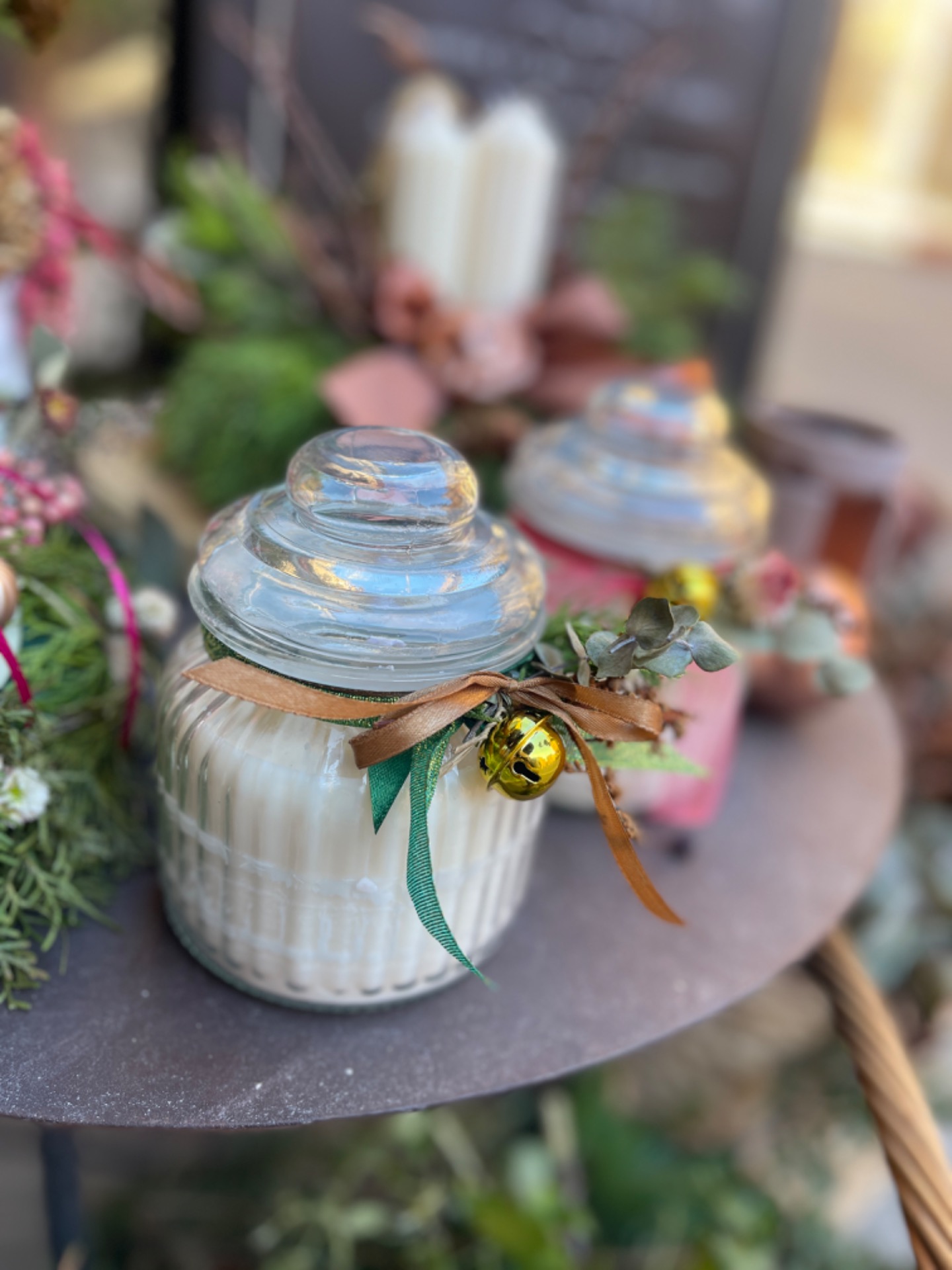 Cozy lights, Christmas scents & golden bells…These handmade candles in glass jars are filled with warmth, christmas scent, dried flowers & love