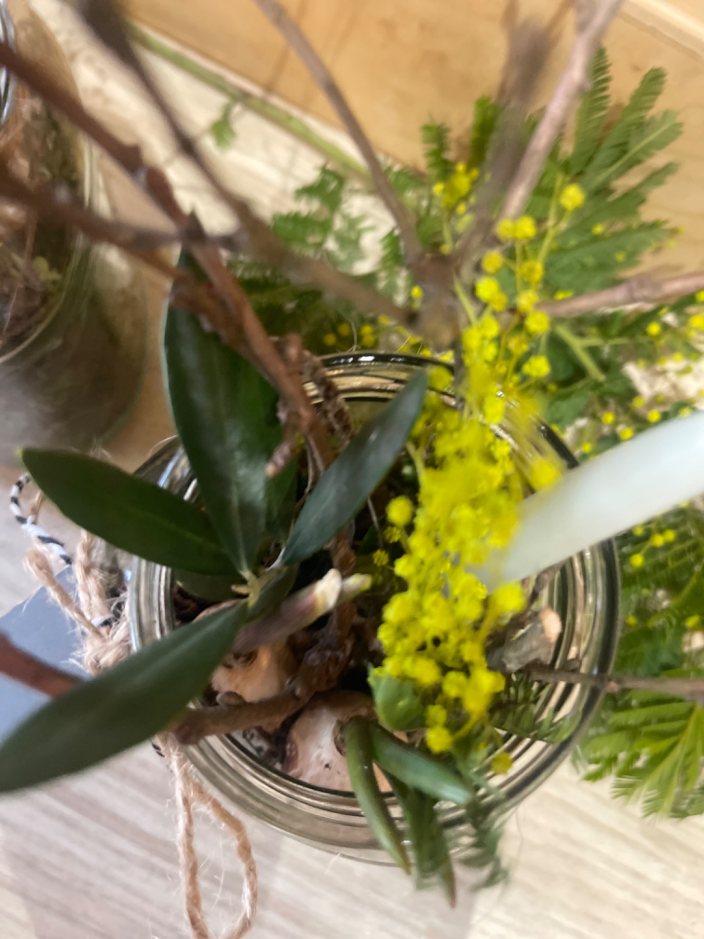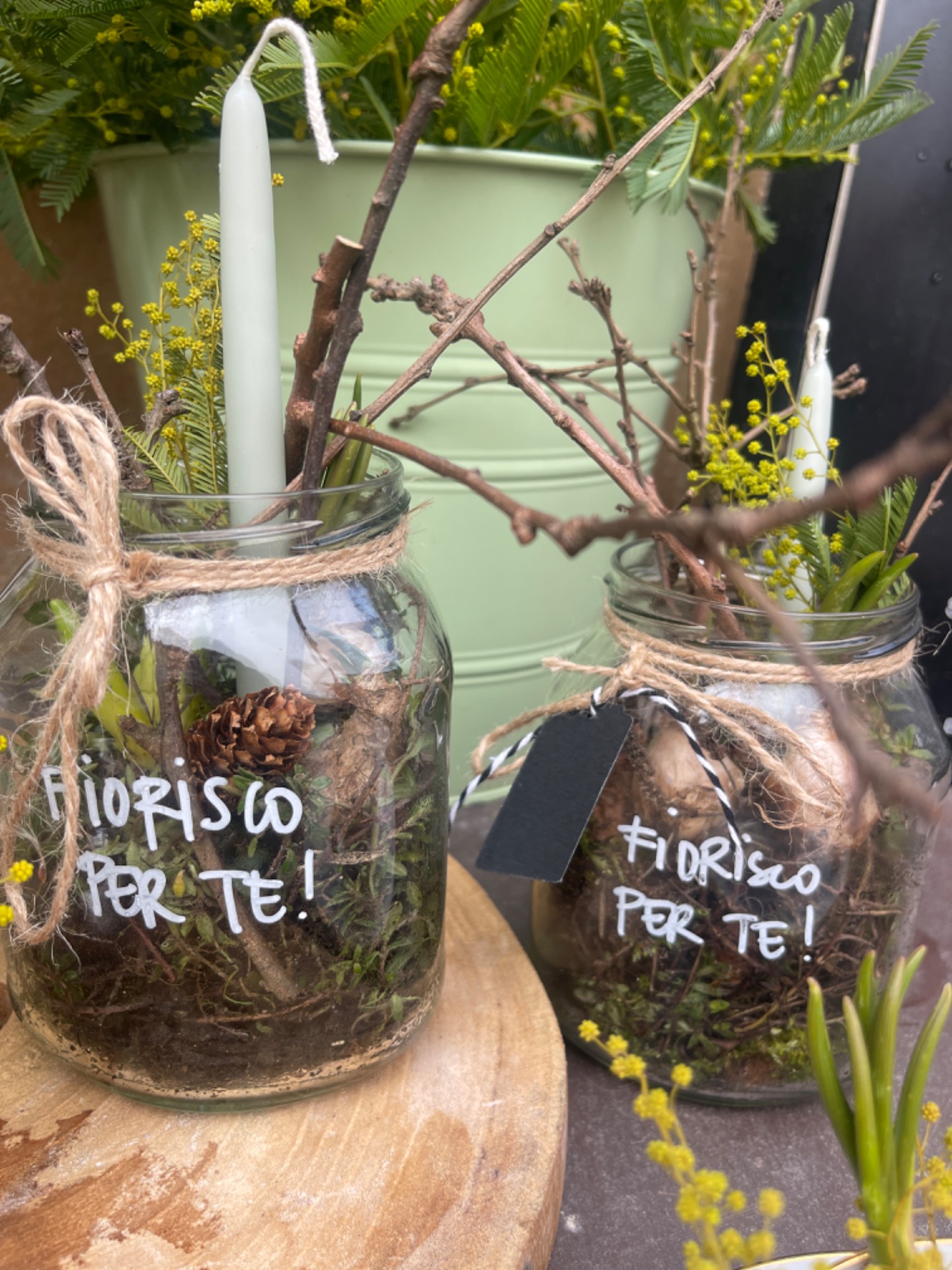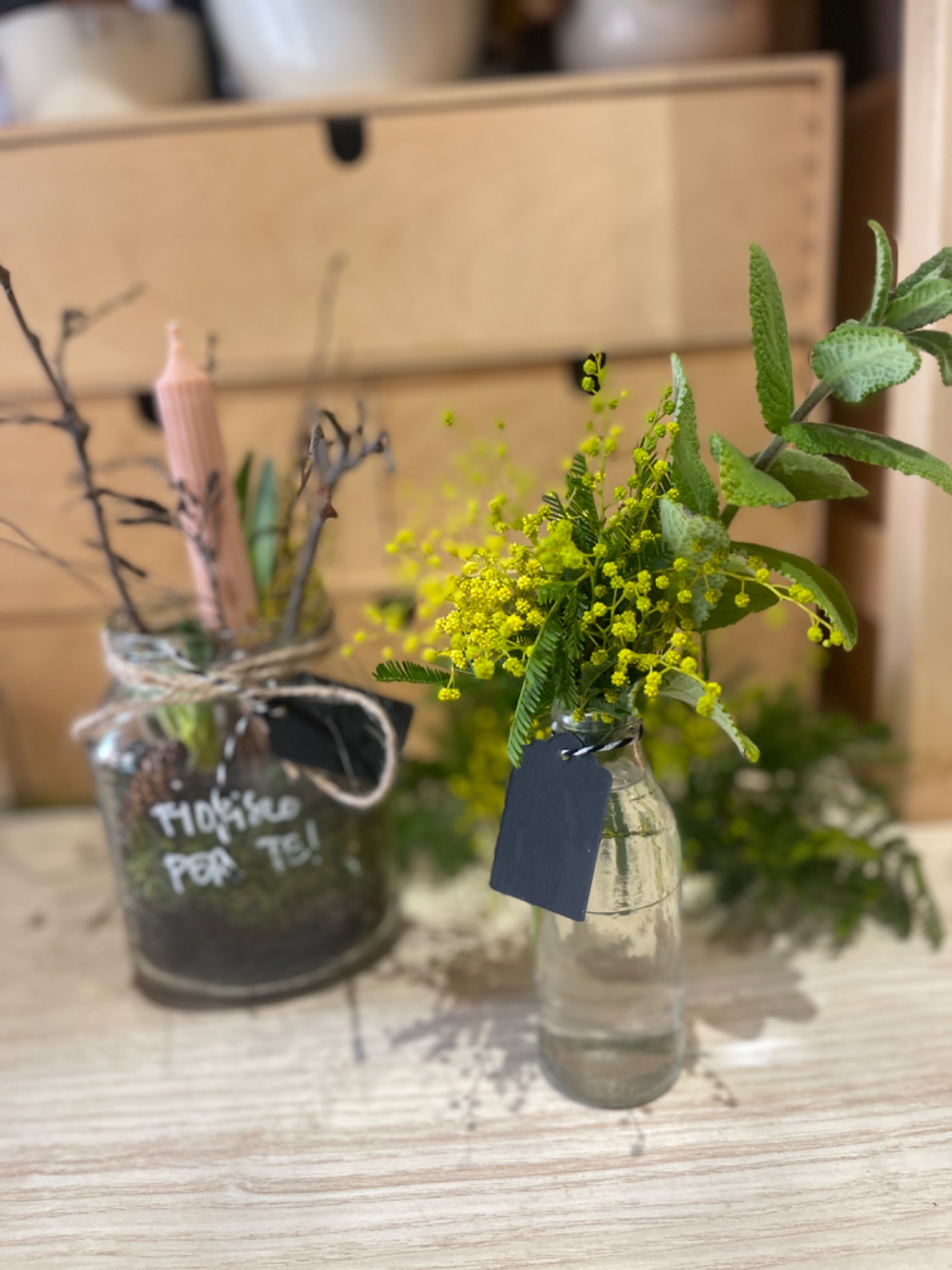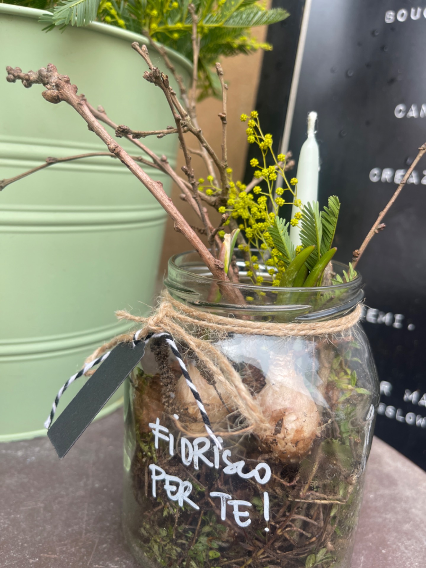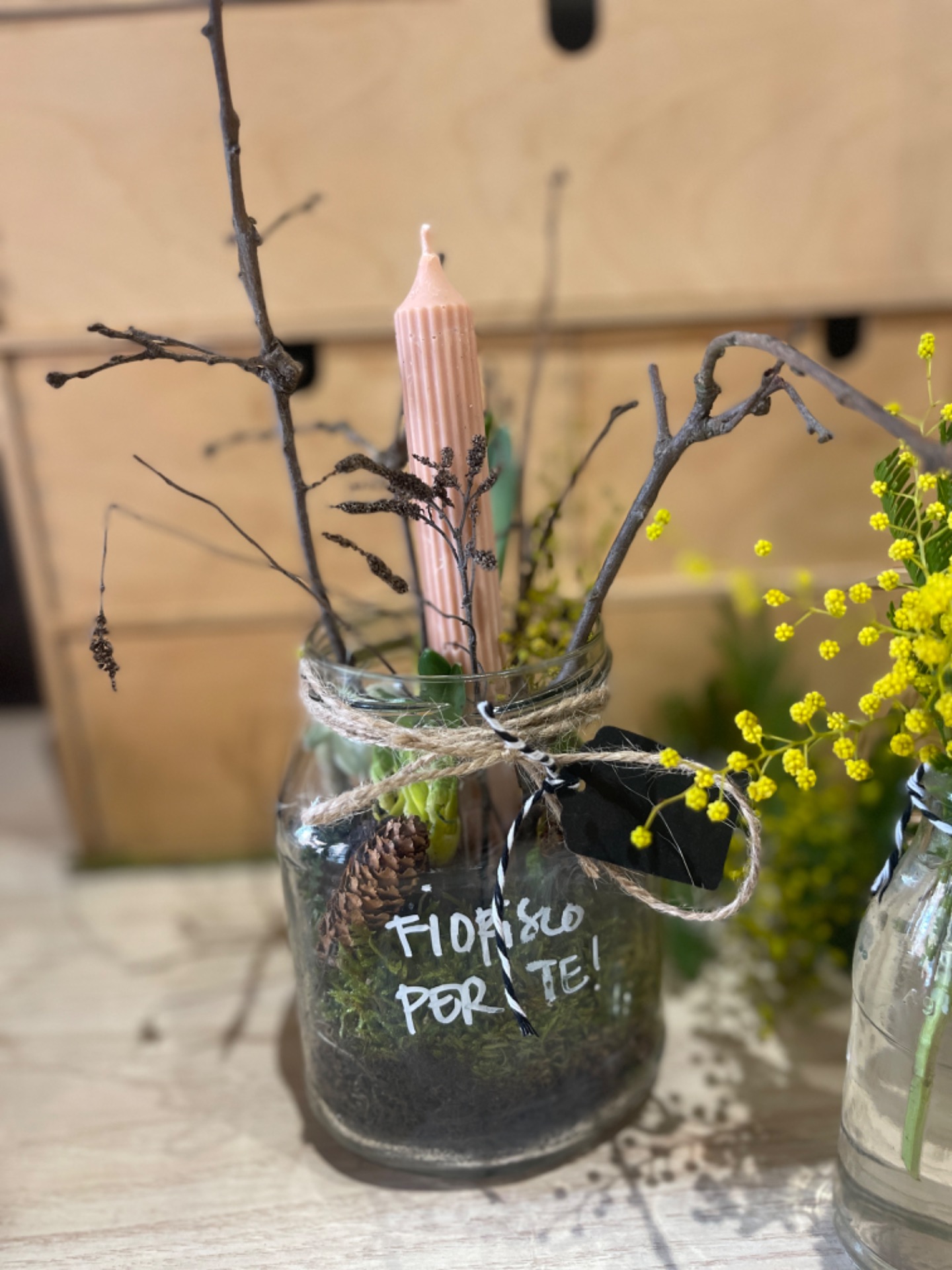 Composizione in vaso di vetro con 5 bulbi selezionati dalla Farm (giacinti e muscari), mimosa stabilizzata proveniente dalla Farm, muschio naturale, rami decorativi e una candela. Realizzata a mano. Ogni pezzo è unico.