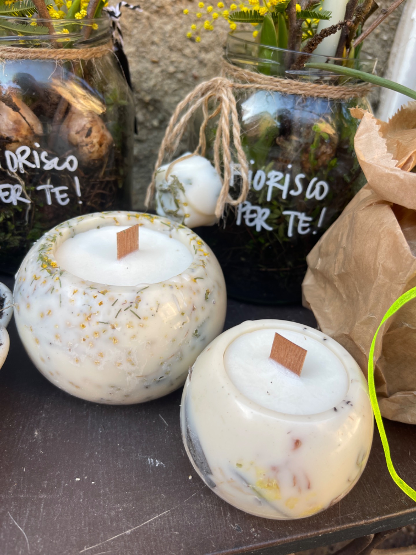 Una candela botanica artigianale realizzata con i fiori essiccati della nostra flower farm.